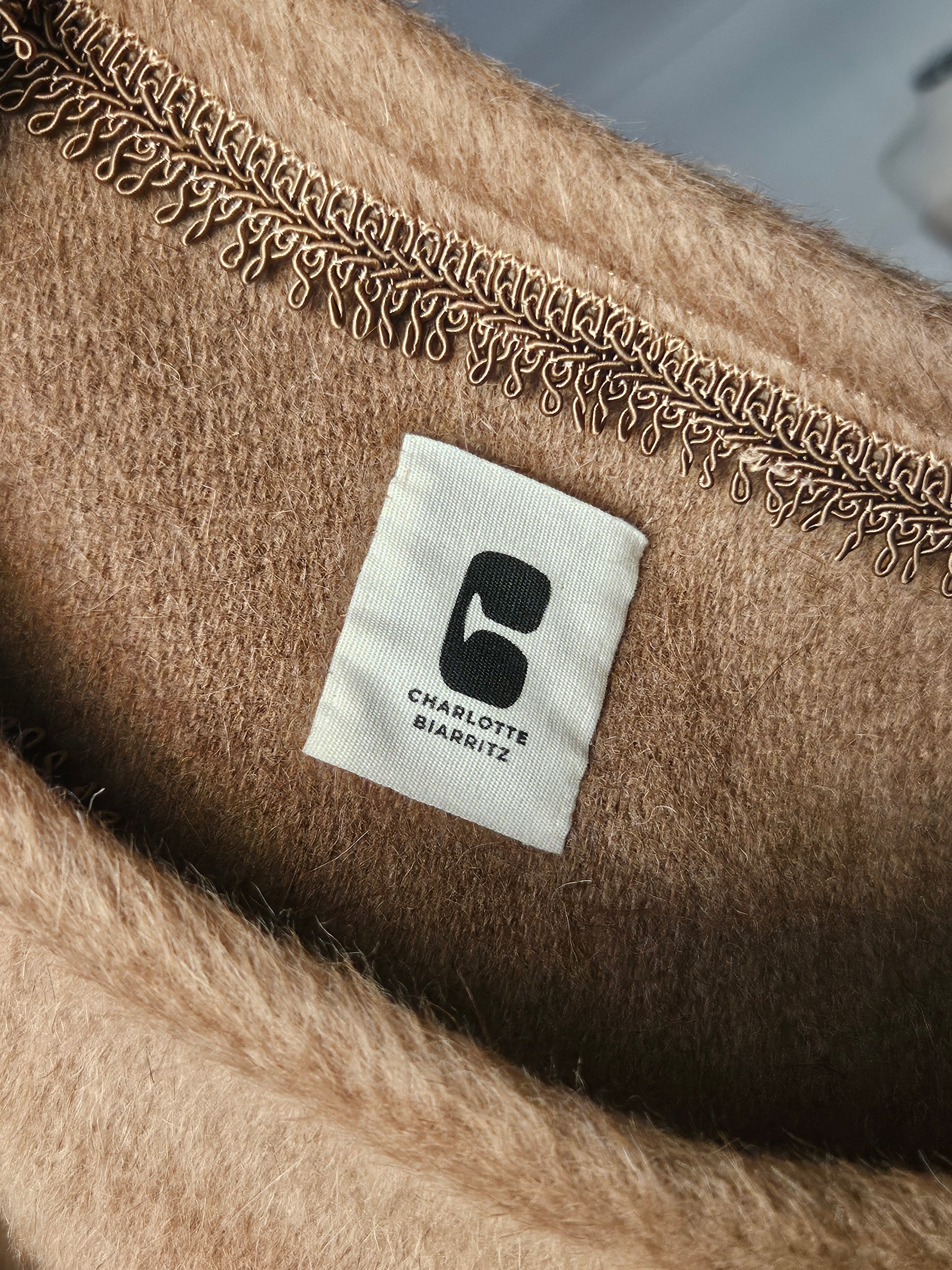 Confectionné dans un tissu hivernal doux et enveloppant, ce capelet se distingue par une signature vintage rare : un galon issu du patrimoine de la Mercerie Charlotte à Biarritz. Chaque pièce porte ainsi une part d’histoire et un charme intemporel.
