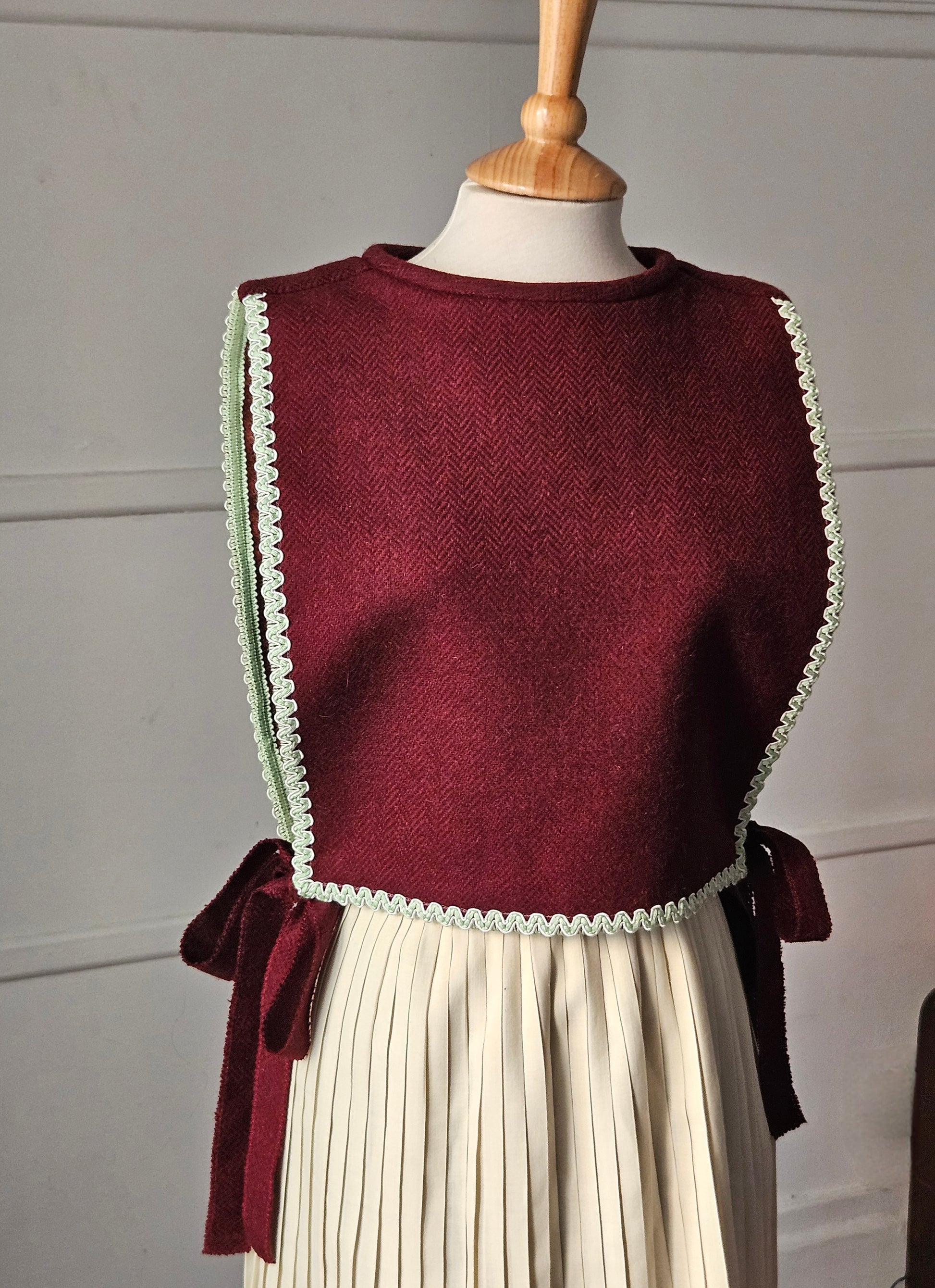 Confectionné dans un tissu hivernal doux et enveloppant, ce capelet se distingue par une signature vintage rare : un galon issu du patrimoine de la Mercerie Charlotte à Biarritz. Chaque pièce porte ainsi une part d’histoire et un charme intemporel.